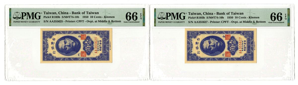 Kinmen, Taiwan, China, 1950. 10 Cents, P-R103b (2) S/M#T74-10b, Issued Banknote Pair, Blue printing in Horizontal format with SYS at top, Back is blue with bank building at center, S/Ns AA355625 & AA355627, Both are PMG graded Gem Uncirculated 66 EPQ. (2). Sold "AS IS" no returns accepted.