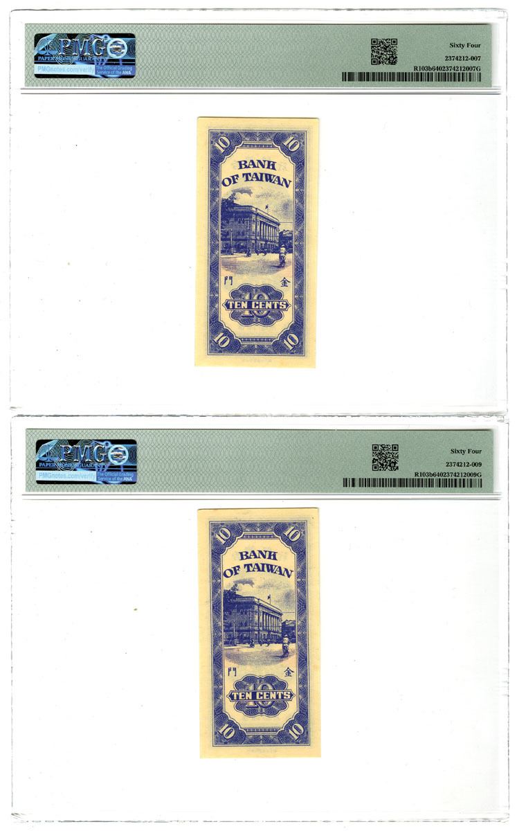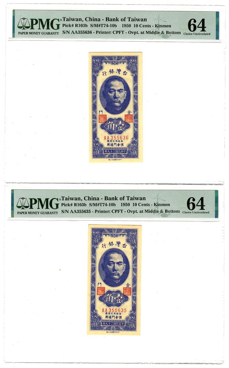Kinmen, Taiwan, China, 1950. 10 Cents, P-R103a (2) S/M#T74-10b, Sequential Pair of Issued Banknotes, Blue printing in Horizontal format with SYS at top, Back is blue with bank building at center, S/Ns AA355635 and AA355636, Both notes are PMG graded Choice Uncirculated 64, CPFT. (2). Sold "AS IS" no returns accepted.