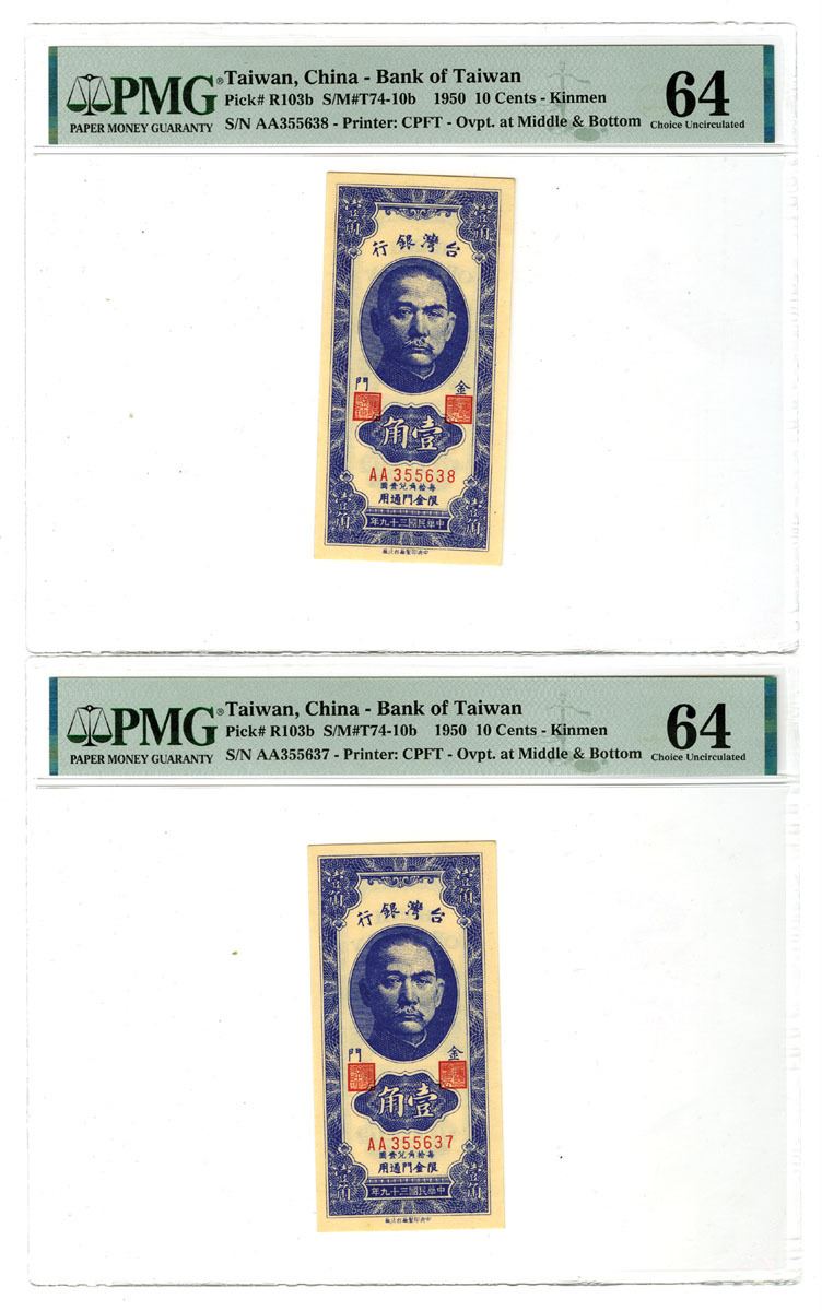 Kinmen, Taiwan, China, 1950. 10 Cents, P-R103b (2) S/M#T74-10b, Sequential Pair of Issued Banknotes, Blue printing in Horizontal format with SYS at top, Back is blue with bank building at center, S/Ns AA355637 and AA355638, Both notes are PMG graded Choice Uncirculated 64, CPFT. (2). Sold "AS IS" no returns accepted.