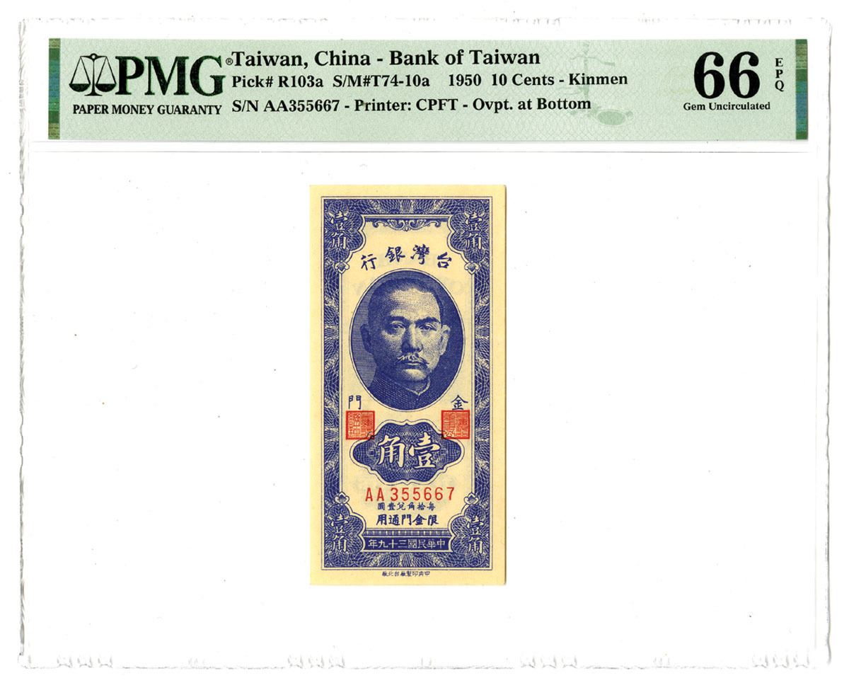 Kinmen, Taiwan, China, 1950. 10 Cents, P-R103a (Should be listed as R103b, not 103a) S/M#T74-10a, Issued Banknote, Blue print in Vertical format with SYS at center, Back is blue with building at center, S/N AA355667, PMG graded Gem Uncirculated 66 EPQ, CPFT.