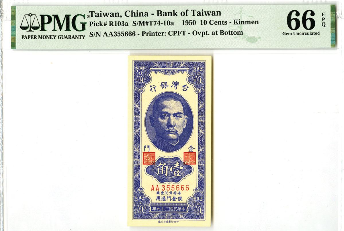 Kinmen, Taiwan, China, 1950. 10 Cents, P-R103a S/M#T74-10a, Issued Banknote, Blue printing in Horizontal format with SYS at top, Back is blue with bank building at center, S/N AA355666, PMG graded Gem Uncirculated 63 EPQ. CPFT.