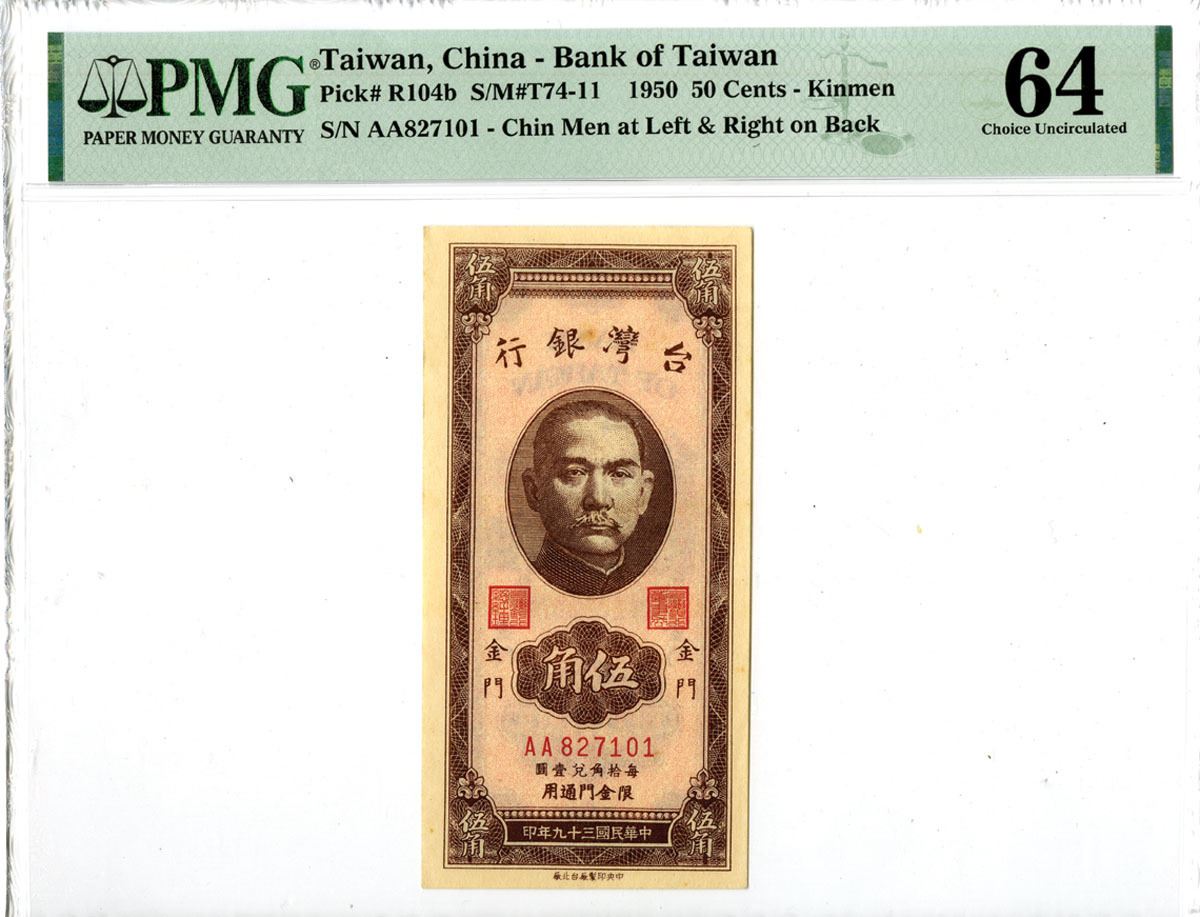 Kinmen, Taiwan, 1950. 50 Cents, P-R104b S/M#T74-11, Issued Banknote, Brown on pink underprint in Vertical format with SYS at center, Back is brown with building at center and Chin Men at left and right, S/N AA827101, PMG graded Choice Uncirculated 64, CPFT.