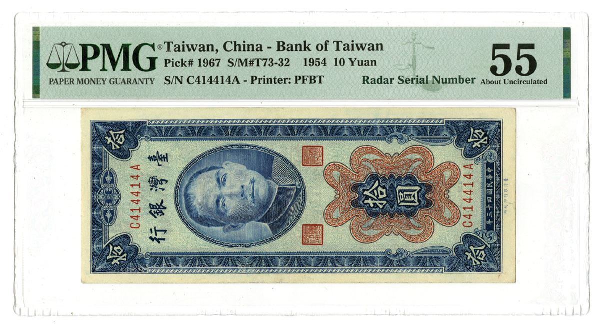 Taiwan, 1954. 10 Yuan, P-1967, S/M#T73-32, Issued Banknote with Radar Serial Number, Blue on m/c underprint with portrait of SYS at top in vertical format, Back is blue with bank building at top, S/N C414414A, PMG graded About Uncirculated 55, PFBT.
