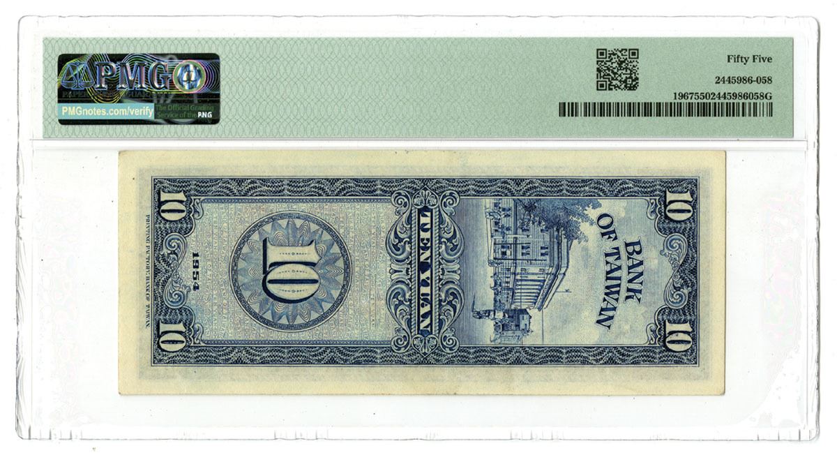 Taiwan, 1954. 10 Yuan, P-1967, S/M#T73-32, Issued Banknote with Radar Serial Number, Blue on m/c underprint with portrait of SYS at top in vertical format, Back is blue with bank building at top, S/N C414414A, PMG graded About Uncirculated 55, PFBT.