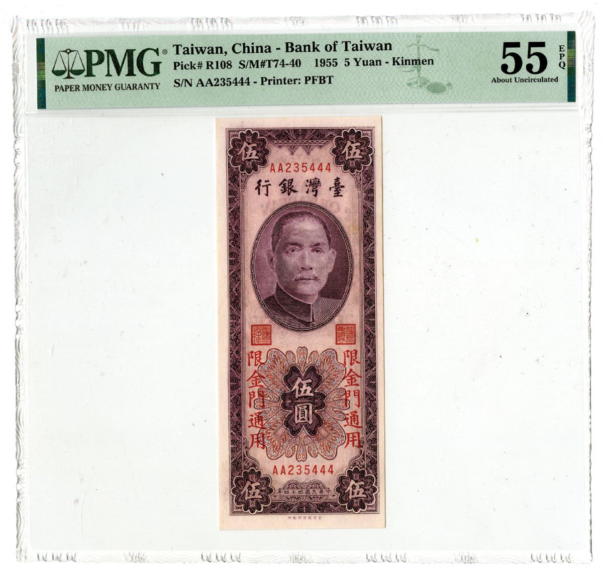 Kinmen, Taiwan, 1955. 5 Yuan, P-R108 S/M#T74-40, Issued Banknote, Purple on pink underprint in Vertical format with SYS at center, Back is purple with building at center, S/N AA235444, PMG graded About Uncirculated 55 EPQ, PFBT.