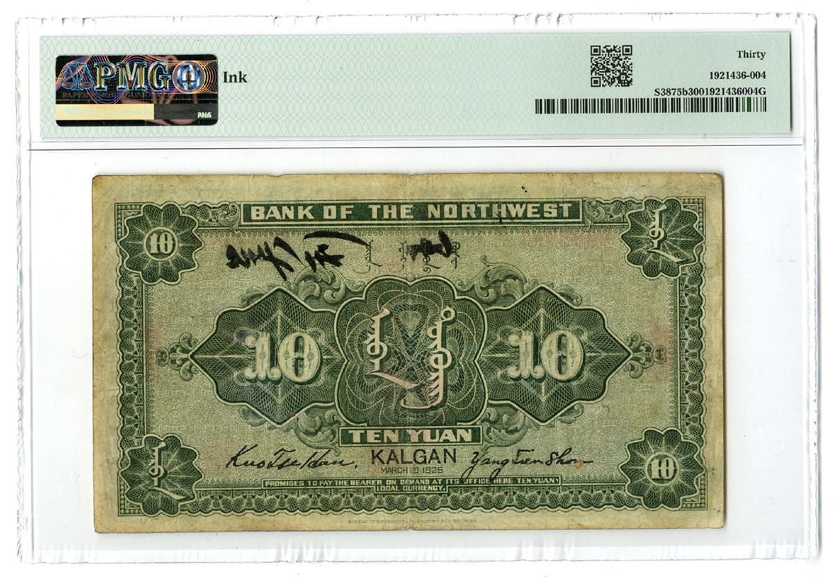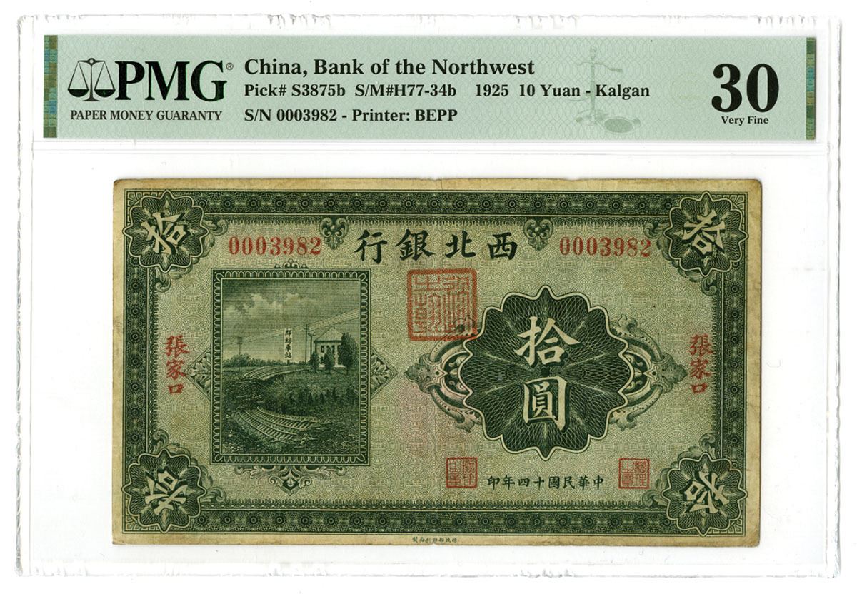 Kalgan, China, 1925, $10 P-S3875b, S/M#H77-34b, Issued banknote, Green with light green underprint, Building and railroad tracks at left, back green with note of ink "graffiti", Low Serial #0003982, PMG graded Very Fine 30, rare note with only 23 examples graded previously by PMG and no auction records are available. Printer: BEPP.