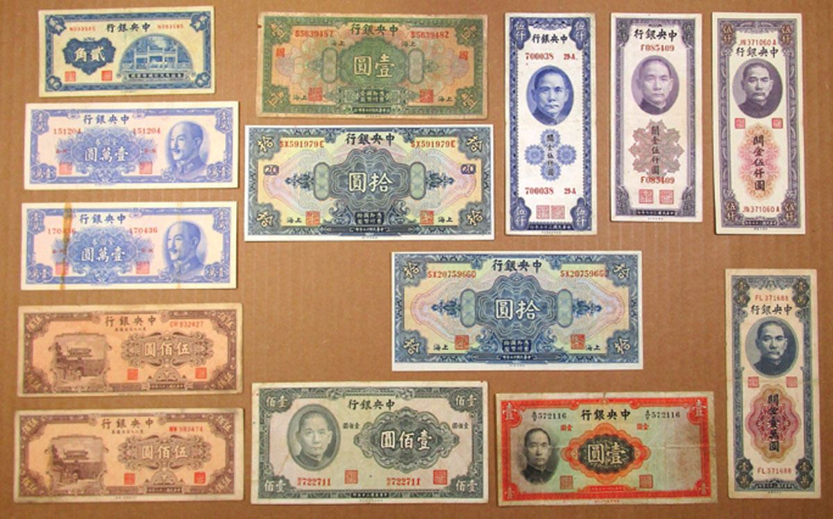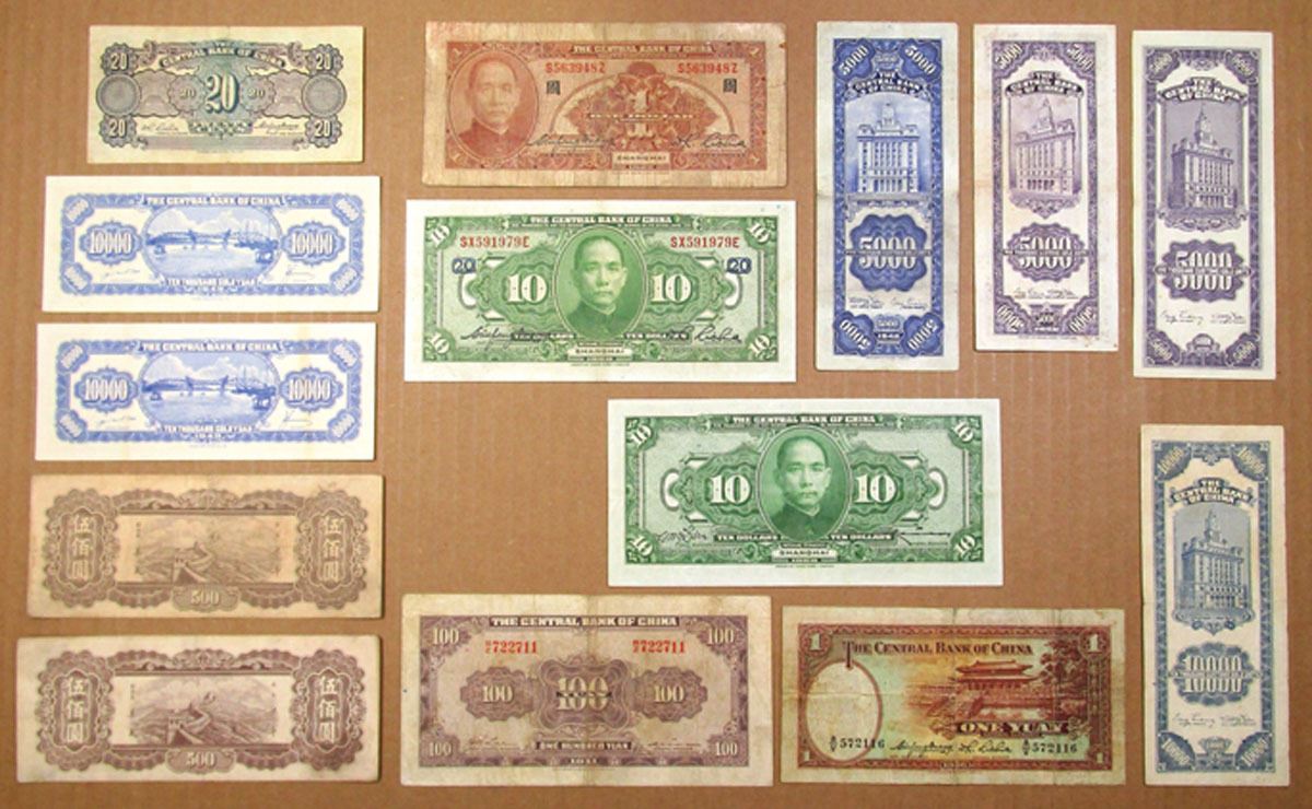 China, 1928-49. Lot of 10+ Issued Banknotes, Includes: 20 Cents, ND; 500 Yuan, ND (2); 5000 CGU, ND; 10,000 CGU, ND; 1 Yuan, 1928; 10 Yuan, 1928 (2); 1 Yuan, 1936; 100 Yuan, 1941; 5000 CGU, 1948; 5000 CGU, 1948; 1000 Yuan, 1949 (2). Notes range from Fine to VF+ condition. (14).