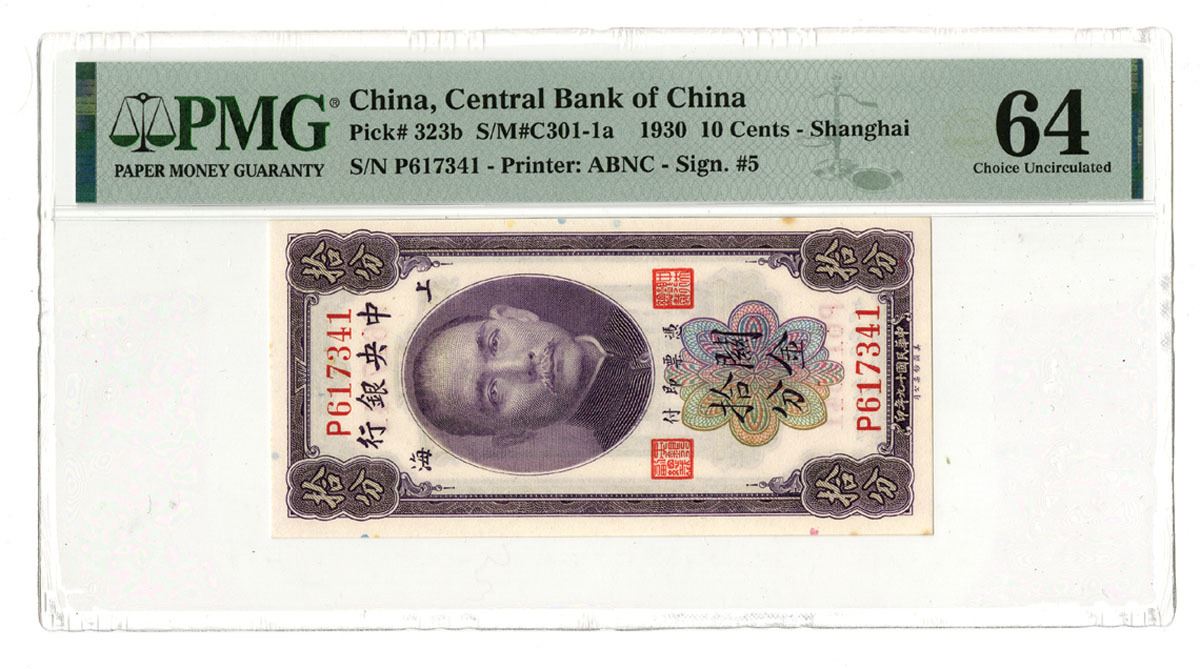 Shanghai, China, 1930. 10 Cents, P-323b S/M#C301-1a, Issued Banknote, Purple on multicolor underprint with SYS at top center, Back is purple with bank building at center, S/N P617341, PMG graded Choice Uncirculated 64, ABNC.
