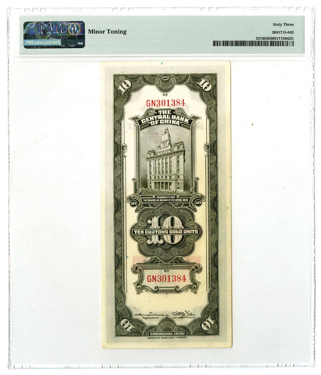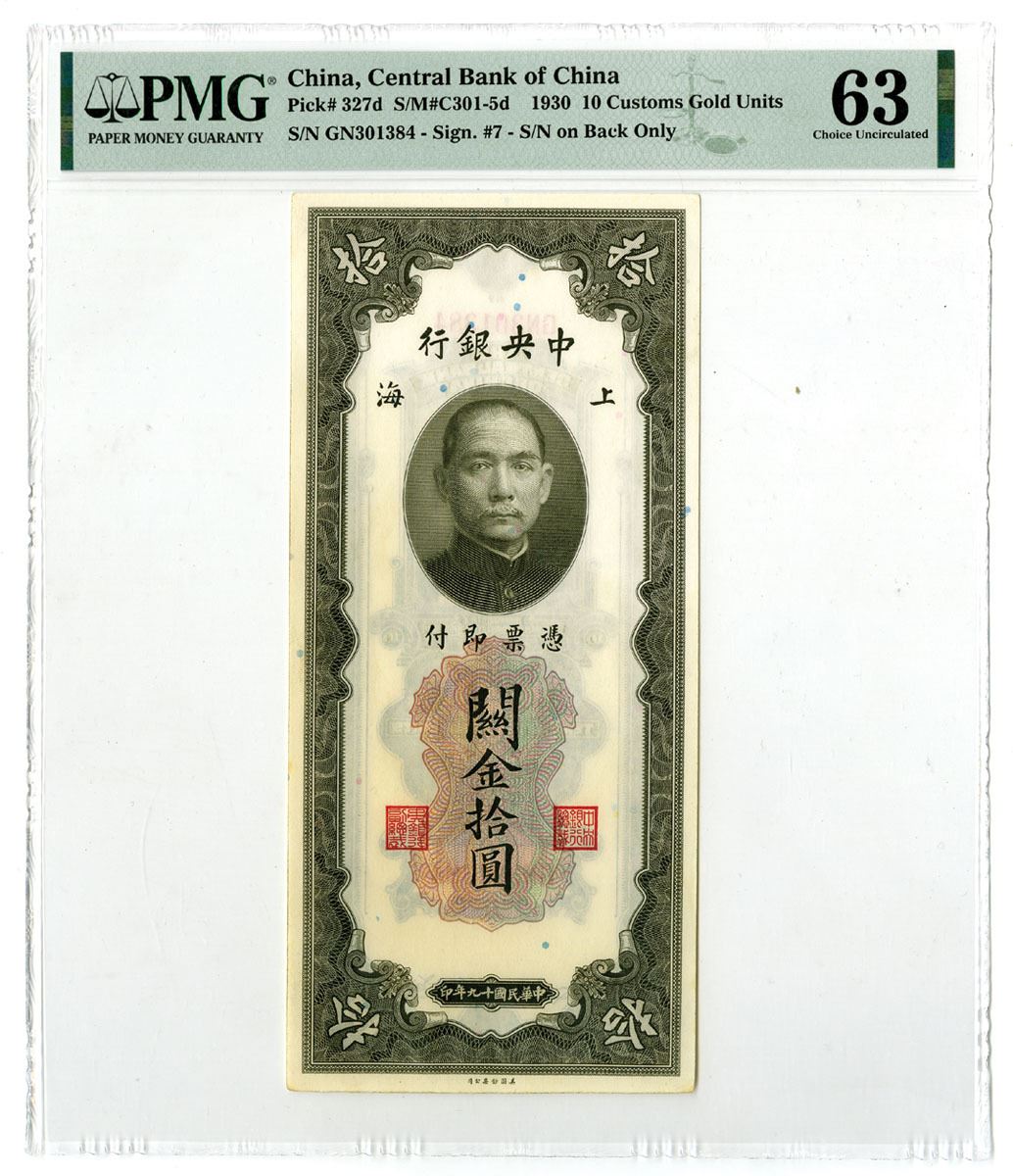 China, 1930. 10 Customs Gold Units, P-327d S/M#C301-5d, Gray on m/c underprint in vertical format, SYS at center, Back is gray with bank building at center, S/N GN301384, PMG graded Choice Uncirculated 63 with comment "Minor Toning" ABNC.