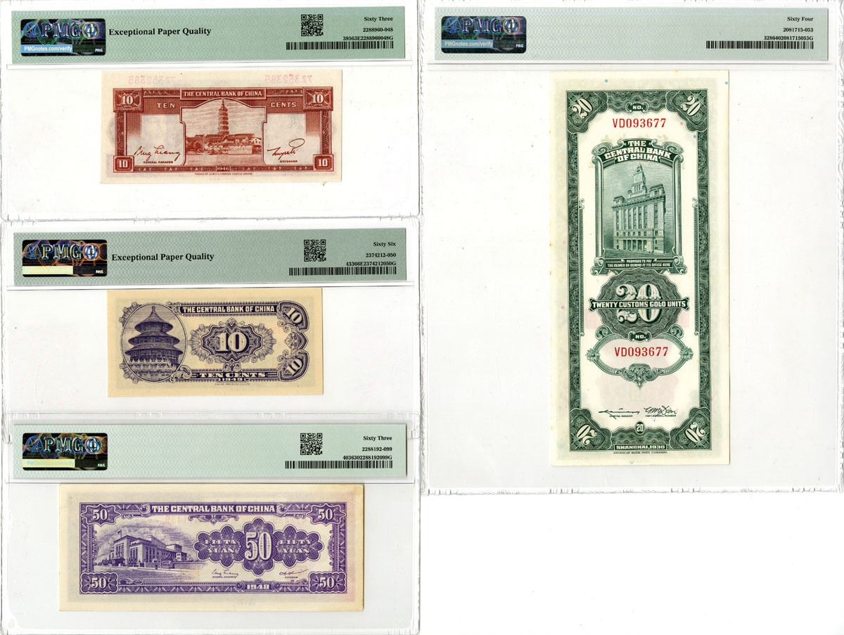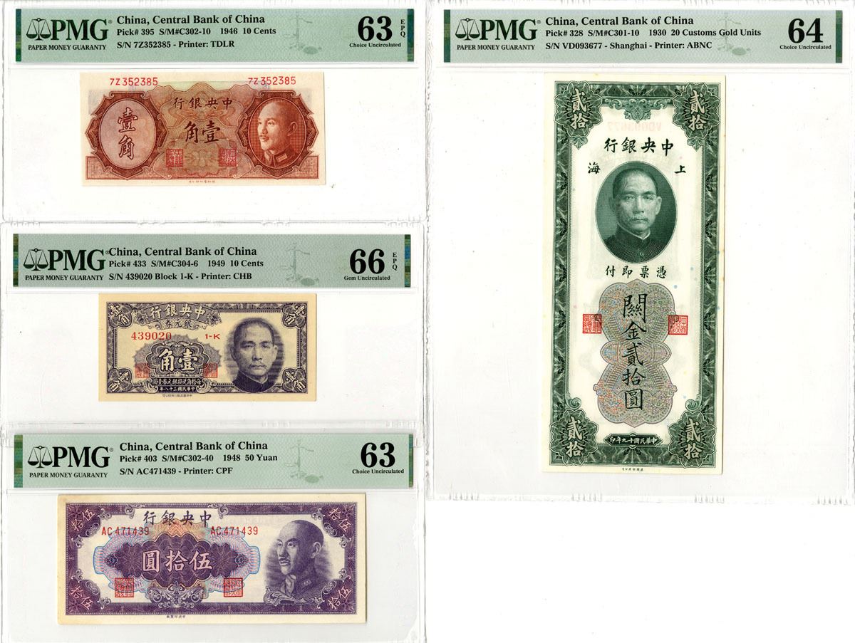 China, 1930-49. Lot of 4 Issued Banknotes, Includes: 1930, 20 Custom Gold Units, P-328, S/M#C301-10, S/N VD093677, PMG graded Choice Uncirculated 64, ABNC; 1946, 10 Cents, P-395 S/M#C302-10, S/N 2X814151, PMG graded Choice Uncirculated 63 EPQ, TDLR; 1948, 50 Yuan, P-403, S/M#C302-40, S/N AC497218, PMG graded Choice Uncirculated 64, CPF; 1949, 10 Cents, P-433 S/M#C304-6, S/N 439020 Block 1-K, PMG graded Gem Uncirculated 66 EPQ, CHB. (4). Sold "AS IS" no returns accepted.