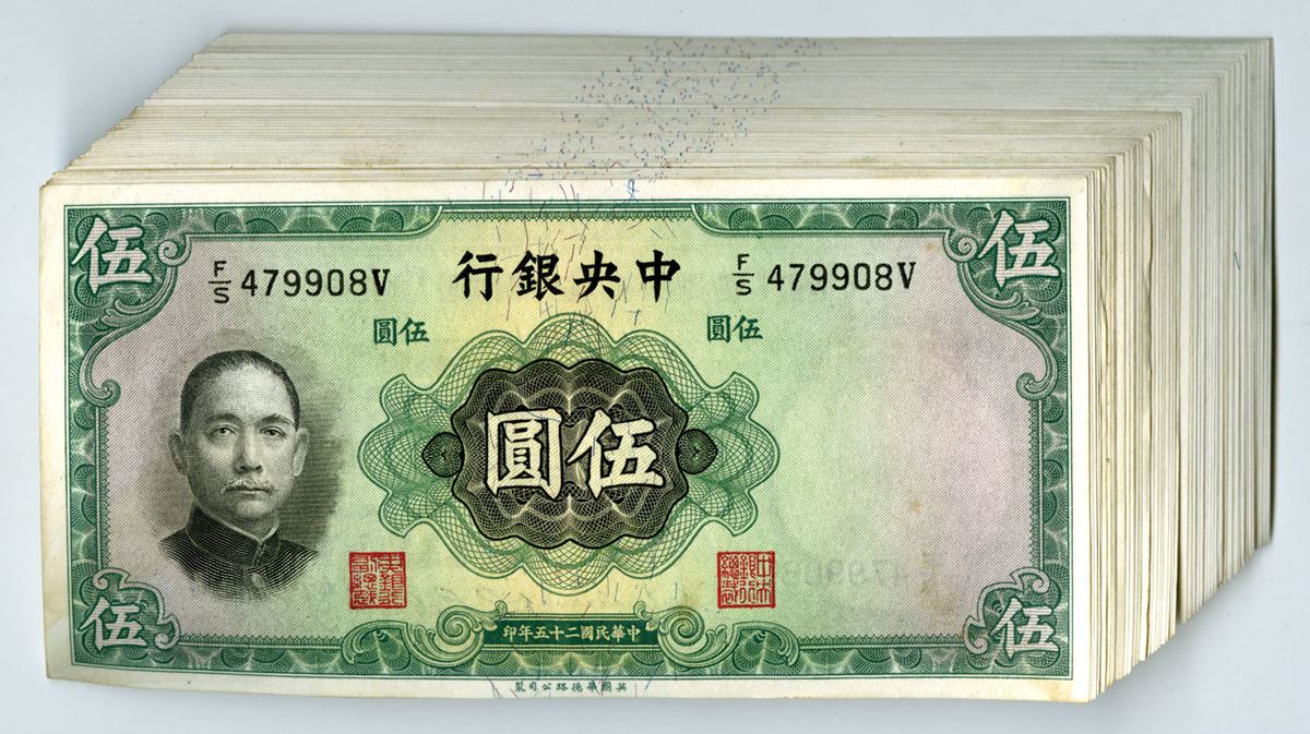 China...., 1936. 5 Yuan, P-217a (57), Issued Banknote Assortment, Green on m/c underprint with SYS at left, Back is green and m/c with Palace of China in Peking at center, Some notes are consecutive, Condition ranges from AU to Uncirculated condition, W&S. (57). Sold "AS IS" no returns accepted