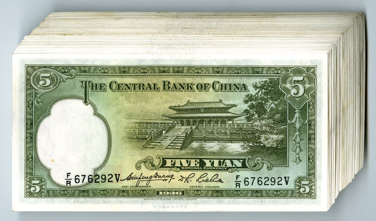 China...., 1936. 5 Yuan, P-217a (57), Issued Banknote Assortment, Green on m/c underprint with SYS at left, Back is green and m/c with Palace of China in Peking at center, Some notes are consecutive, Condition ranges from AU to Uncirculated condition, W&S. (57). Sold "AS IS" no returns accepted