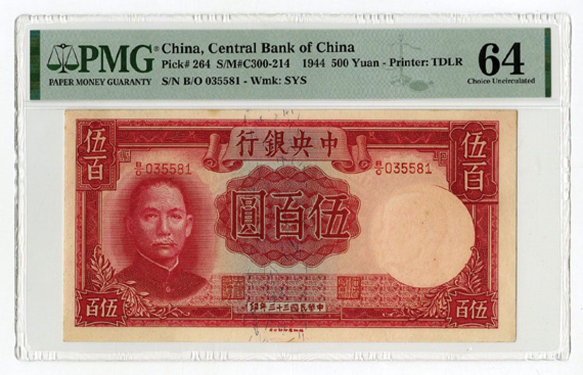 China, 1944. 500 Yuan, P-264, S/M#C300-214, Issued Banknote, Red on blue underprint, Portrait SYS at left, S/N B/O 035581, PMG graded Choice Uncirculated 64, Printer: TDLR.