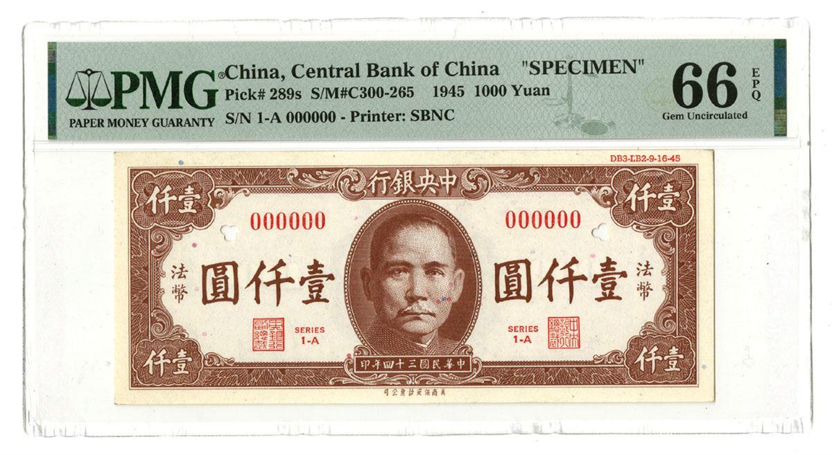 China, 1945. 1000 Yuan, P-289s S/M#C300-265, Color Trial Specimen Banknote, Reddish Brown face with SYS at center, Back is Light brown, S/N 1-A 000000, Top right margin has printed in small red letters " DB3-LB2-9-16-45" which refers to the order number and shade selection as well as date printed, PMG graded Gem Uncirculated 66 EPQ, SBNC.