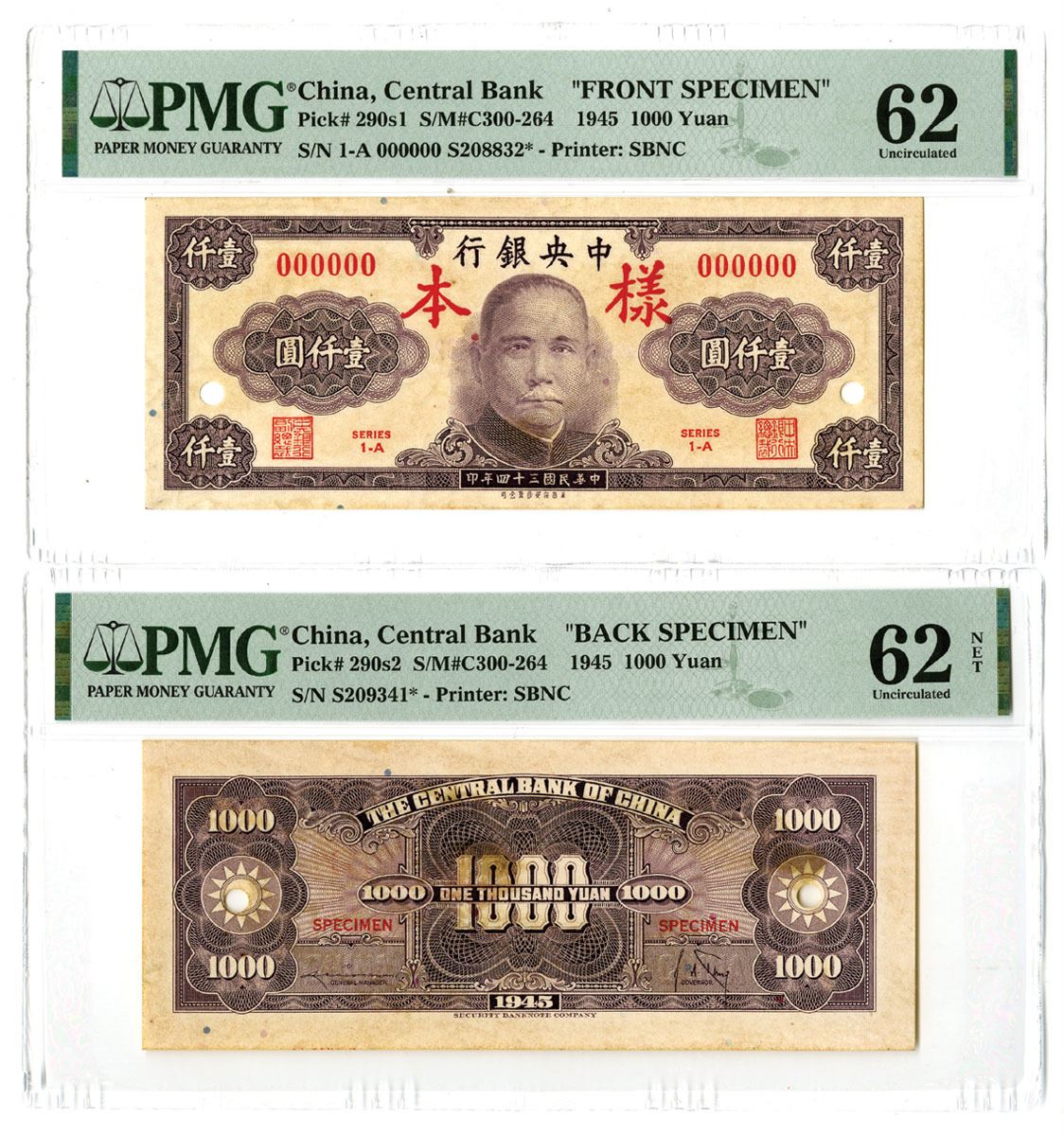 China, 1945. 1000 Yuan, P-290s1 (S/M#C300-264) and P-290s2, Front and Back Specimen Banknotes, Front is Maroon with SYS at center and Back is Maroon with denomination at center, S/Ns 1-A 000000 S208832* and S209341*, Both notes have POCs and Specimen overprints, Front is PMG graded Uncirculated 62 and back is Uncirculated 62 NET - both have comment "Previously Mounted," SBNC. (2). Sold "AS IS" no returns accepted.