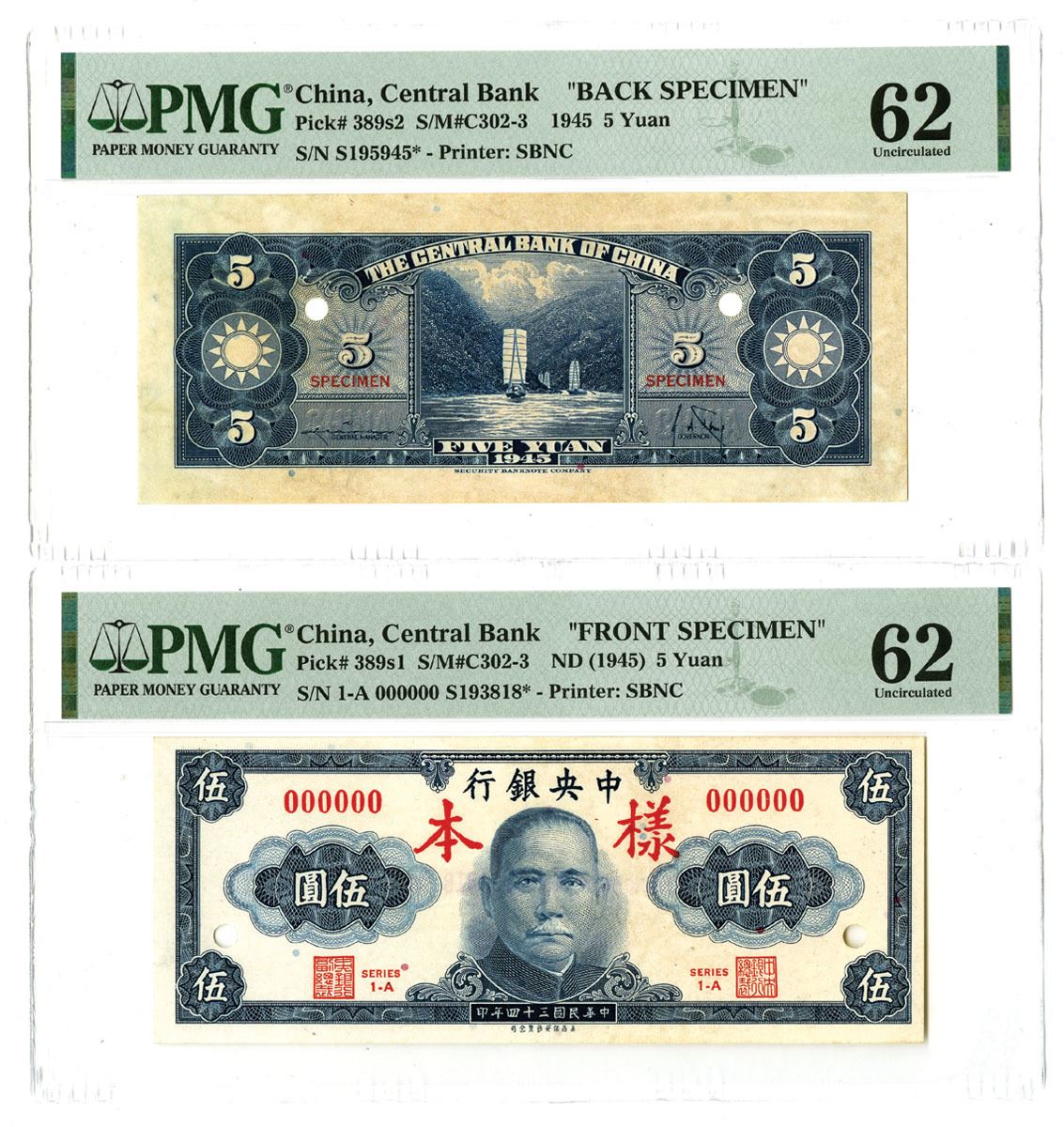 China, 1945. 5 Yuan, P-389s1 (S/M#C302-3) and P-389s2, Front and Back Specimen Banknotes, Front is Blue with SYS at center and Back is Blue with Sampan on water at center, S/Ns 1-A 000000 S193818* and S195945*, Both notes have POCs and Specimen overprints and both are PMG graded Uncirculated 62 with comment "Previously Mounted," SBNC. (2). Sold "AS IS" no returns accepted. None have been offered previously at auction. Only known as a specimen.