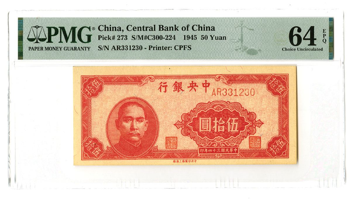 China, 1945. 50 Yuan, P-273 S/M#C300-224, Issued Banknote, Red printing with SYS at left, Back is red with denomination at left and right, S/N AR331230, PMG graded Choice Uncirculated 64 EPQ, CPFS.