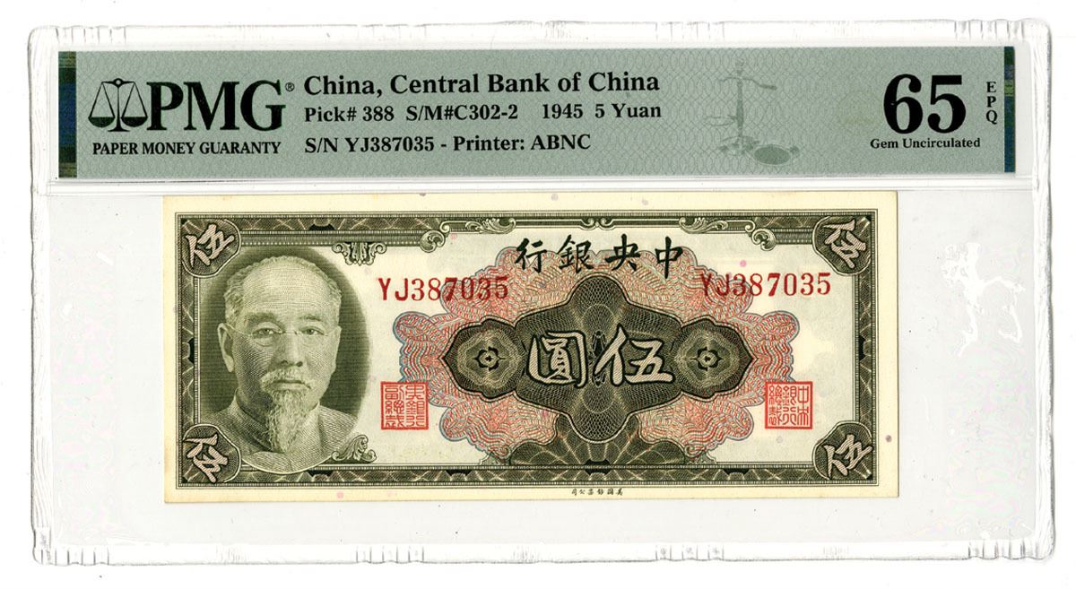 China, 1945. 5 Yuan, P-388 S/M#C302-2, Issued Banknote, Olive green on m/c underprint with portrait of Lin Sun at left, Back is deep olive green with temple at right, S/N YJ387035, PMG graded Gem Uncirculated 65 EPQ, ABNC.