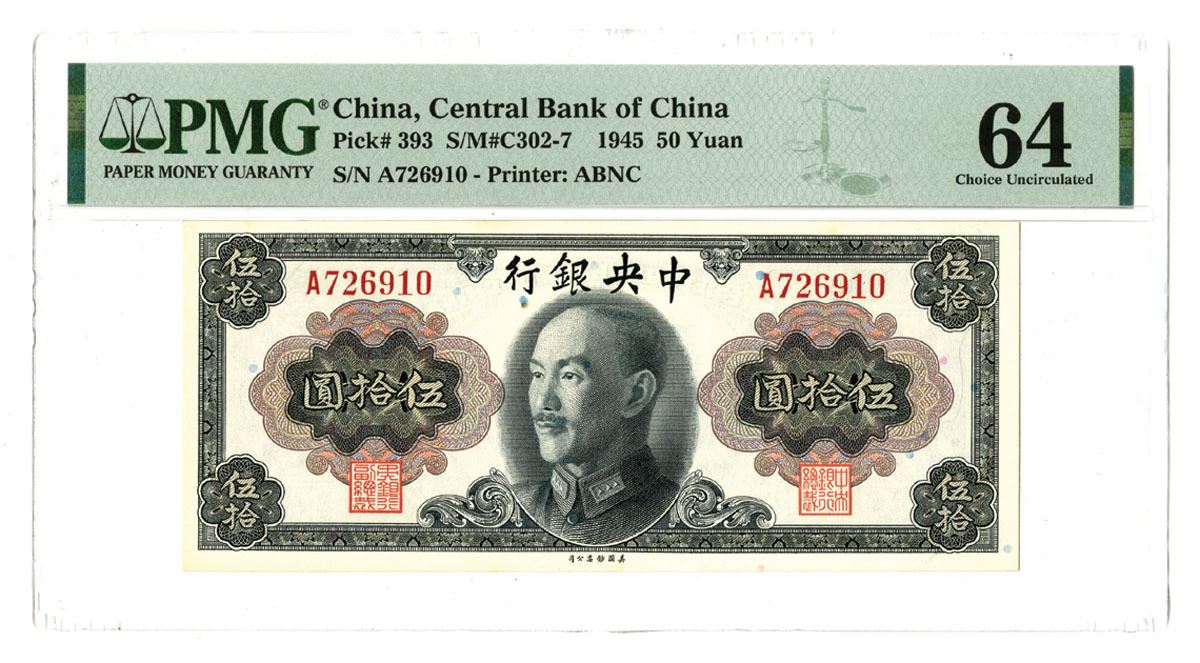 China, 1945. 50 Yuan, P-393 S/M#C302-7, Issued Banknote, Black on m/c underprint with CKS at center, Back is black with ariel view of Chinese City, S/N A726910, PMG graded Choice Uncirculated 64, ABNC.