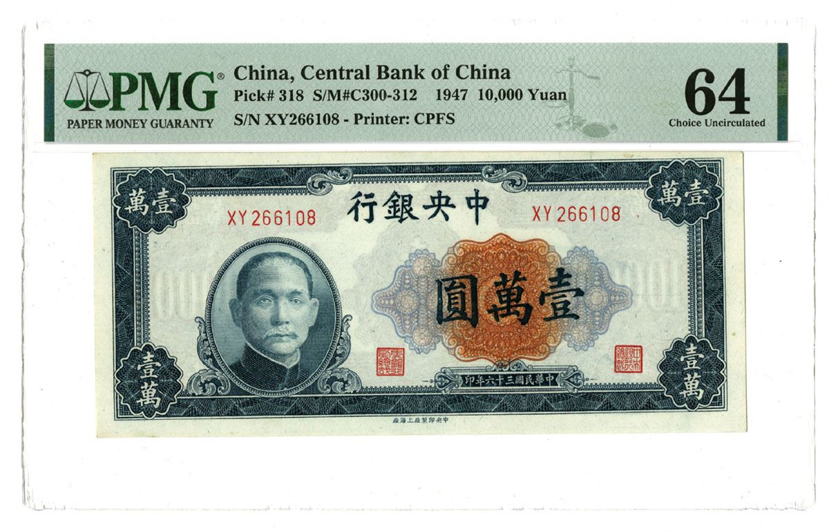 China, 1947. 10,000 Yuan, P-318 S/M#C300-312, Issued Banknote, Gray-blue on m/c underprint with SYS at left, Back is blue with denomination at left and right, S/N XY266108, PMG graded Choice Uncirculated 64, CPFS.