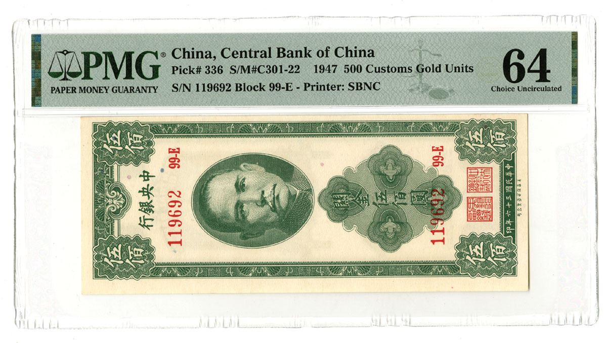 China, 1947. 500 Customs Gold Units, P-336 S/M#C301-22, Issued Banknote, Light green printing with SYS at top center, Back is green with bank building at center, Vertical style banknote, S/N 119692 Block 99-E, PMG graded Choice Uncirculated 64, SBNC.