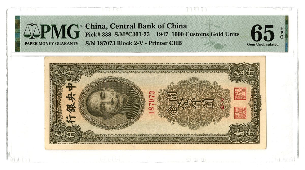 China, 1947. 1000 Customs Gold Units, P-338 S/M#C301-25, Issued Banknote, Olive on m/c underprint with SYS at top center, Back is olive with bank building at center, Vertical style banknote, S/N 187073 Block 2-V, PMG graded Gem Uncirculated 65 EPQ, SBNC.