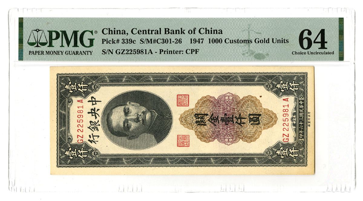 China, 1947. 1000 Custom Gold Units, P-339c S/M#C301-26, Issued Banknote, Gray with brown and lilac guilloche with SYS at top in vertical format, Back is gray-blue with bank building at center, S/N GZ225981A, PMG graded Choice Uncirculated 64 with comment "Minor Rust," CPF.