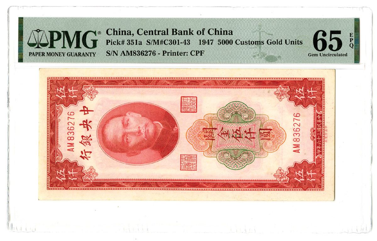China, 1947. 5000 Customs Gold Units, P-351a S/M#C301-43, Issued Banknote, Red on m/c with SYS at top in vertical format, Back is red with bank building at center, S/N AM836276, PMG graded Gem Uncirculated 65 EPQ, CPF.
