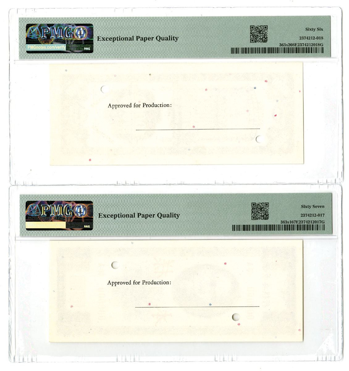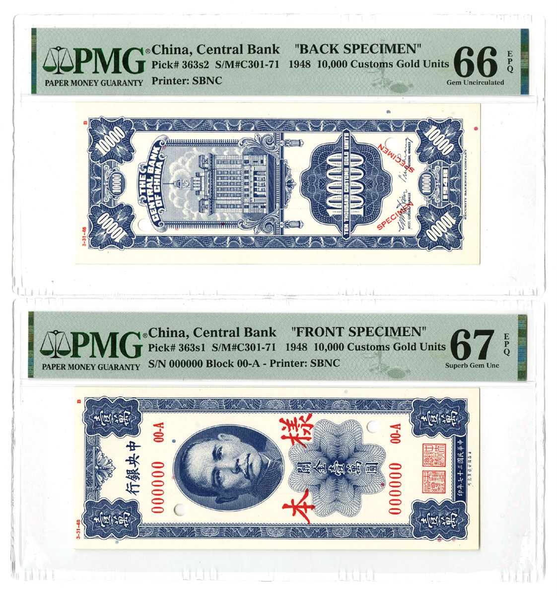 China, 1948. 10,000 CGU's, P-363s1 and P-363s2, S/M#C301-71, Unlisted Color Trial (Not listed on PMG holders) Uniface Front and Back Specimen Banknotes, Obverse is Blue with portrait of SYS in middle, Red "00000" serial numbers, POC's, Reverse is Blue with Bank Building at center, the Obverse upper margin has red overprint "3-31-48 -B" and the reverse has the same overprint. Both with Specimen Overprints and POCs, Both notes are PMG graded: The Obverse is Superb Gem Unc 67 EPQ and the Reverse is Gem Unc 66 EPQ, SBNC. (2). Sold "AS IS" no returns accepted. Both are close to the "Top Pop" for this issue.