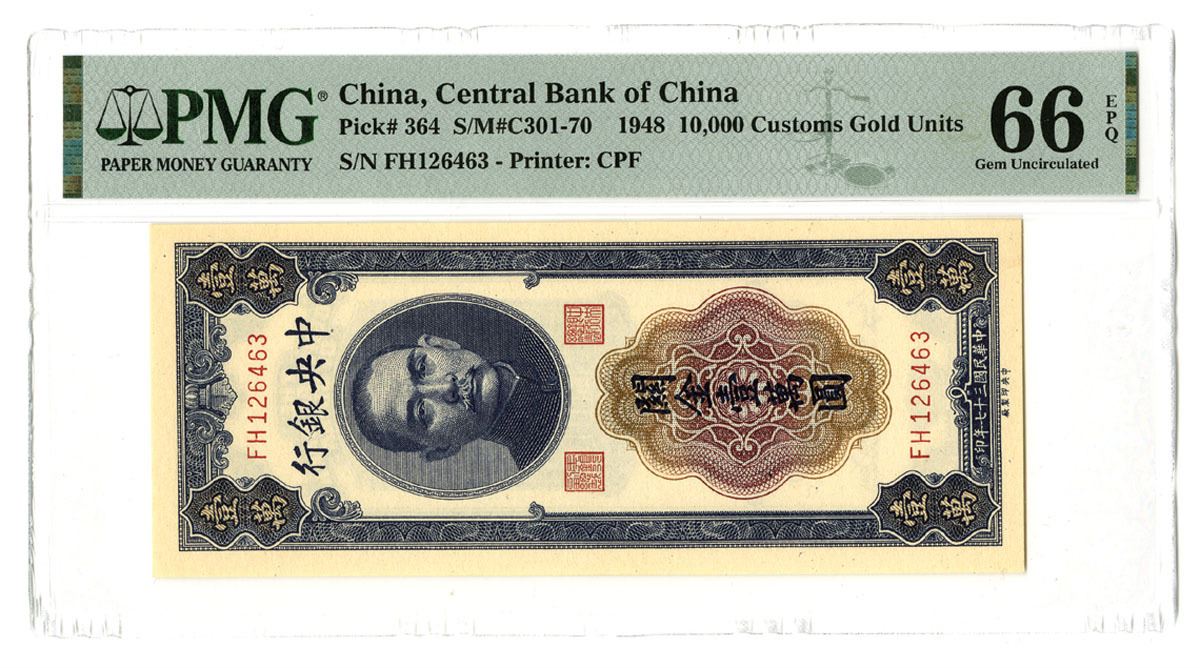 China, 1948. 10,000 Custom Gold Units, P-364 S/M#C301-70, Issued Banknote, Blue on m/c underprint with SYS at top, Back is blue with bank building at top of note, Vertical style banknote, S/N FR126463, PMG graded Gem Uncirculated 66 EPQ, CPF.