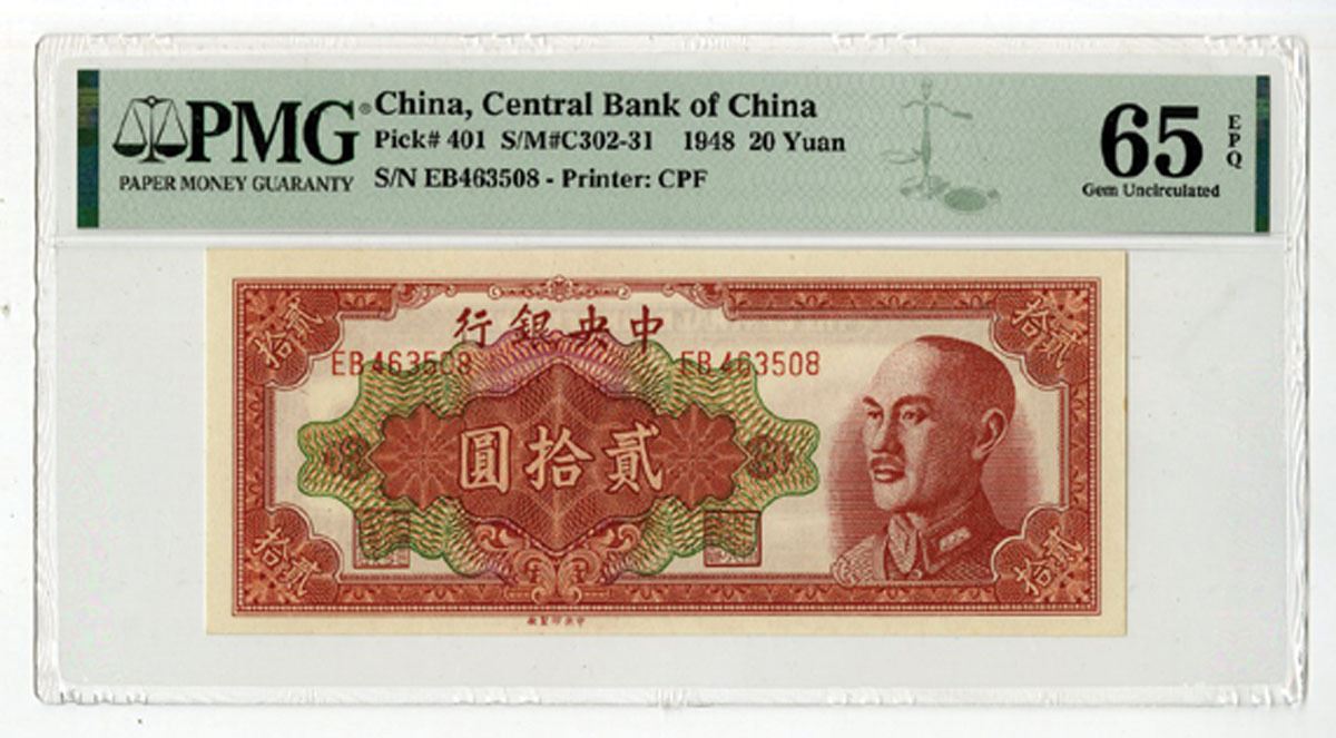China, 1948. 20 Yuan, P-401, S/M#C302-31, Issued banknote, Red on m/c underprint, CKC at right, back red, S/N EB463508, PMG graded Gem Uncirculated 65 EPQ, Scarce note in this high of condition. Printer: CPF.
