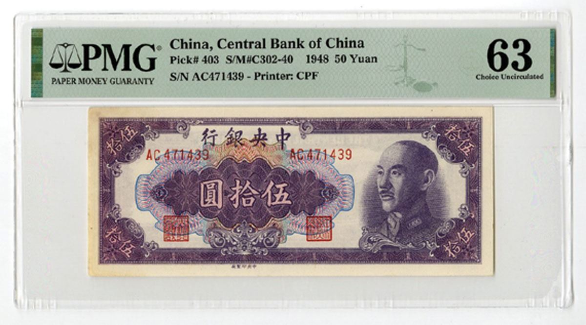 China, 1948. 50 Yuan, P-403, S/M#C302-40, Issued Banknote. Purple on m/c underprint with portrait of CKS at right. S/N AC497218, PMG graded Choice Uncirculated 64, CPF.
