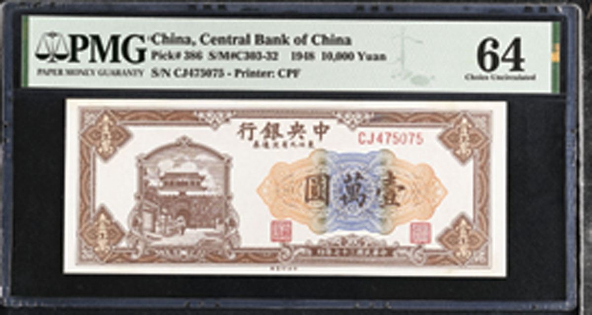 China, 1948. 10,000 Yuan, P-386, S/M#C303-32, Issued Banknote, Brown on m/c underprint with City gate at left, Back is brown with Great Wall of China at center, S/N CJ475075, PMG graded Choice Uncirculated 64, CPF.