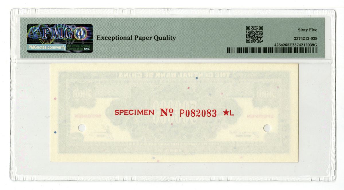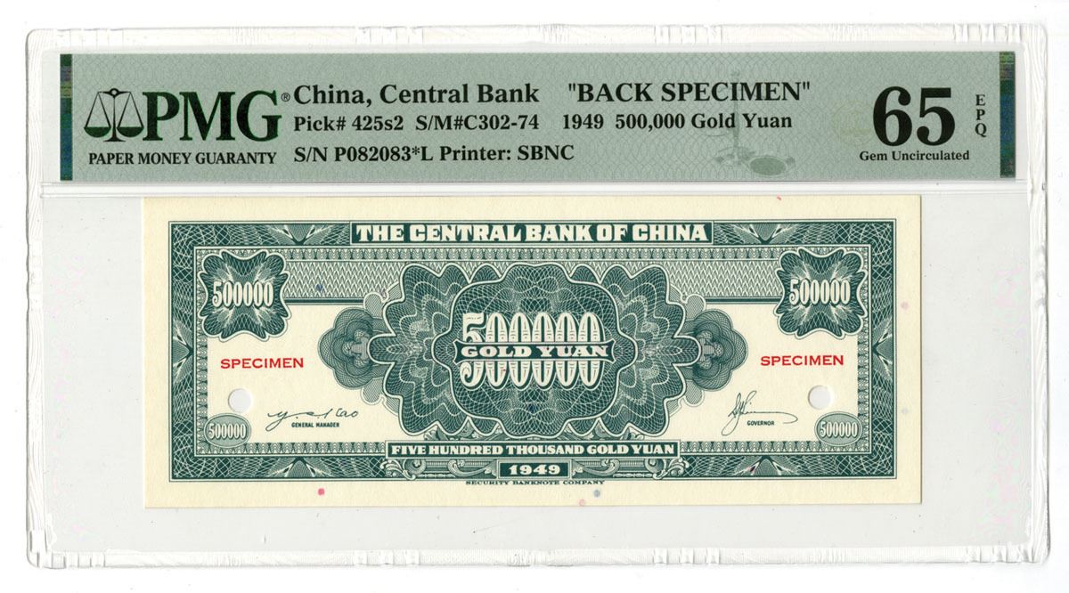 China, 1949. 500,000 Gold Yuan, P-425s2 S/M#C302-74, Uniface Back Specimen Banknote, Green print with Bank title at top and denomination at center and top left/right corners, Specimen overprints and POCs, PMG graded Gem Uncirculated 65 EPQ. SBNC.