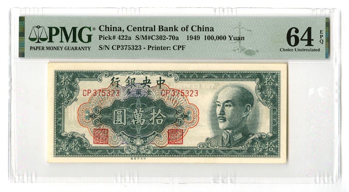 China, 1949. 100,000 Yuan, P-422a S/M# C302-70a, Issued Banknote, Dark green on m/c with CKS at right, Back is green with bank building at center, S/N CP375323, PMG graded Choice Uncirculated 64 EPQ. CPF.