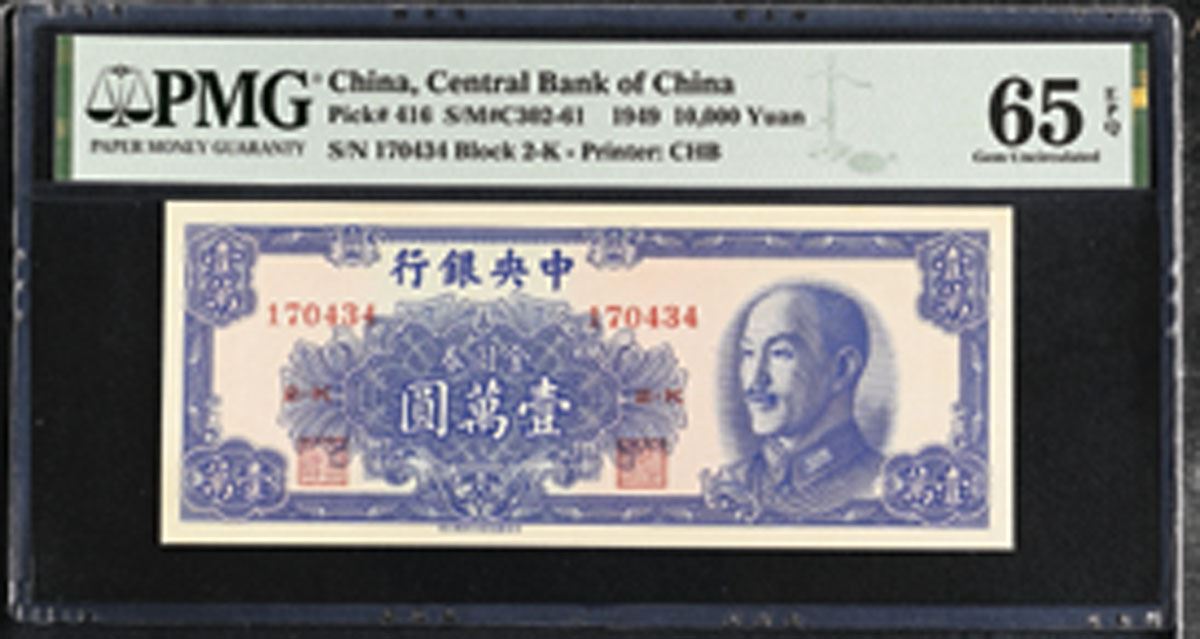China, 1949. 10,000 Yuan, P-416 S/M#C302-61, Issued Banknote, Dark blue on light blue and pink underprint with CKS at right, Back is blue with bridge at center, S/N 170434 Block 2-K, PMG graded Gem Uncirculated 65 EPQ. CHB.