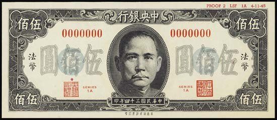 1, 2. P-283. 1945. 500 Yuan. Specimen and back proof. 3. P-340. 2000 CGU's. Specimen. 3 different banknotes, 2 specimens with red specimen overprints, "00000" serial numbers and POC's; 1 uniface back. Scarce group. Uncirculated condition. SBNC and ABNC.