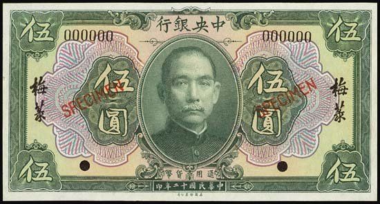 P-175c. 1923. $5. Green front, red back. Specimen banknote. Red specimen overprint, "00000" serial numbers and POC. Gem uncirculated condition. Never issued. ABNC. Extremely rare banknote.
