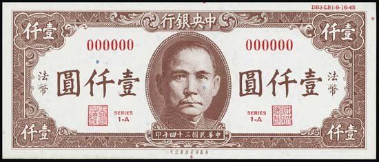 P-289 Unlisted Trial Color, 1945, 1000 Yuan. Specimen trial color banknotes. Front is reddish brown and back is a lighter brown. "00000" serial numbers in red, Series 1-A near bottom and "DB3-LB1-9-16-45" on upper right corner of front. Rare. SBNC.