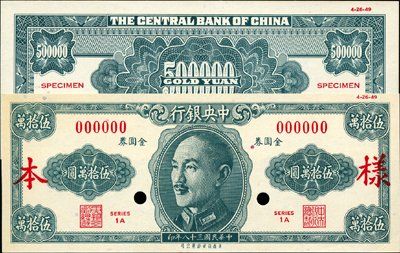1949. P-Unlisted. 500,000 Gold Yuan Front and back specimens. Uniface front specimen has "000000" serial numbers, Series 1A, 2 large Chinese characters and 2 signatures. Back banknote has "Specimen" overprints. Punched out cancels. Rare note. No similar examples are listed in Pick. Both are dated in the upper right corner "4-26-49". Back of each note has printed "Approved for Production" with a line to sign, but both are blank. SBNC.