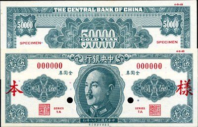 1949. P-Unlisted. 50,000 Gold Yuan Front and back uniface specimens. Uniface front specimen has "000000" serial numbers, Series 1A, 2 large Chinese characters and 2 signatures. Back banknote has "Specimen" overprints. Punched out cancels. Rare note. No similar examples are listed in Pick. Back are dated in the upper right corner "4-26-49". Back of each note has "Approved for Production: L-4, Color O.K. 4-12-49" printed in red. SBNC.