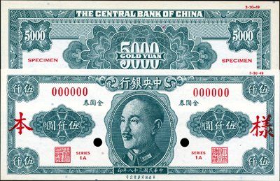 1949. P-Unlisted. 5,000 Gold Yuan Front and back uniface specimens. Uniface front specimen has "000000" serial numbers, Series 1A, 2 large Chinese characters and 2 signatures. Back banknote has "Specimen" overprints. Punched out cancels. Rare note. No similar examples are listed in Pick. Back are dated in the upper right corner "3-30-49". Back of each note has printed "Approved for Production" with a line to sign, but both are blank. SBNC.
