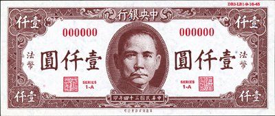 1945. P-289 A Unlisted Trial Color. 1,000 Yuan Specimen trial color banknotes. One of 3 different versions of P-289 being offered in this auction. Front is reddish brown and back is a lighter brown. "00000" serial numbers in red, Series 1-A near bottom and "DB3-LB1-9-16-45" on upper right corner of front. Rare. Unc. SBNC.