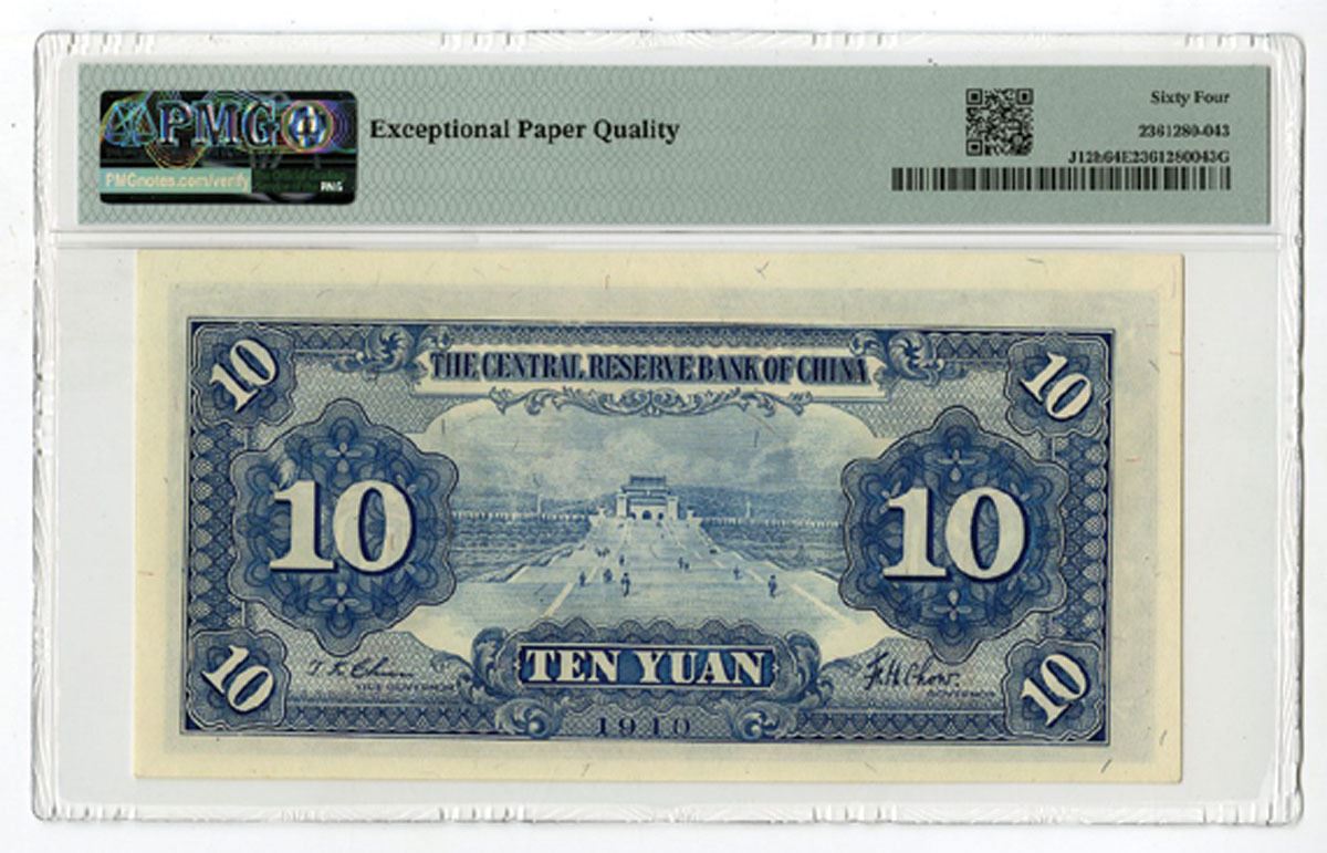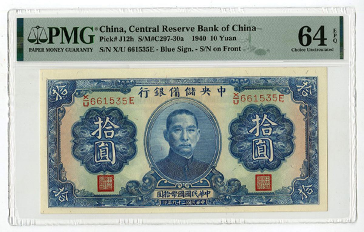 China, 1940. 10 Yuan, P-J21h S/M#C297-30a, Issued Banknote, Blue on m/c underprint with SYS at center, S/N X/U 661535E, PMG graded Choice Uncirculated 64 EPQ.