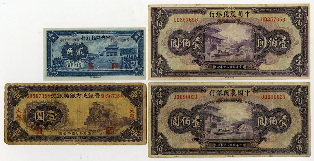 China. 1934-41. Lot of 4 Issued Banknotes, Includes: Central Reserve Bank of China 20 Cents = 2 Chiao, P-J4a, 1940, WPC; Farmers Bank of China 100 Yuan, P-477a (2) S/M#C290-83b, 1941, ABNC; Bank of Local Railways of Shansi and Suiyan 1 Yuan, P-S1294c S/M#C180-10c, 1934, BEP, repaired. Notes range from Fine with Repairs to AU+ condition. (4). Sold "AS IS" no returns accepted.