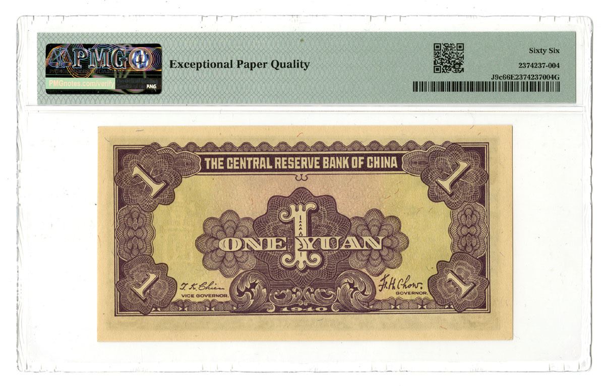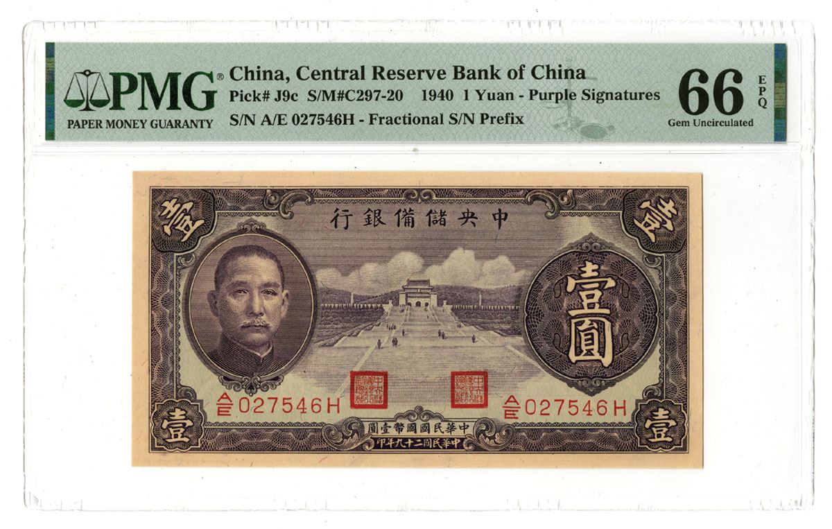 China, 1940. 1 Yuan, P-J9c S/M#C297-20, Issued banknote, Purple on green underprint with SYS at left and Temple of Heaven at center, Back is purple on m/c, S/N A/E 027546H, PMG graded Gem Uncirculated 66 EPQ. Only 4 notes grade higher out of 797 notes graded in the PMG census. This will be impossible to improve upon.