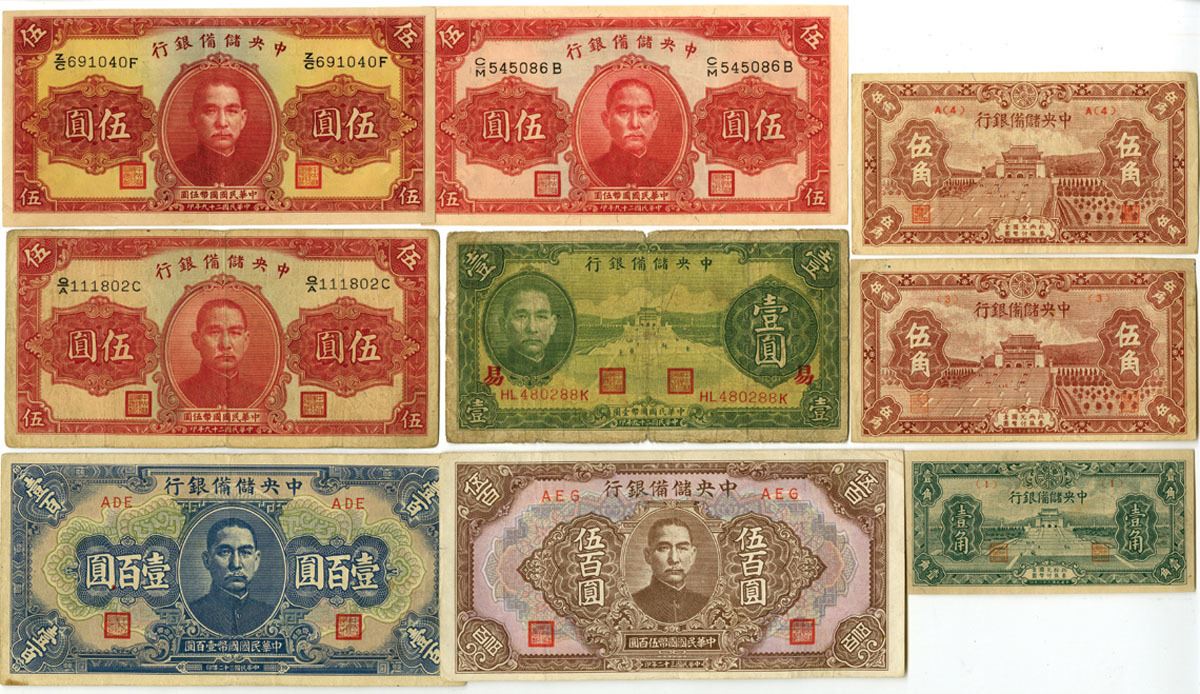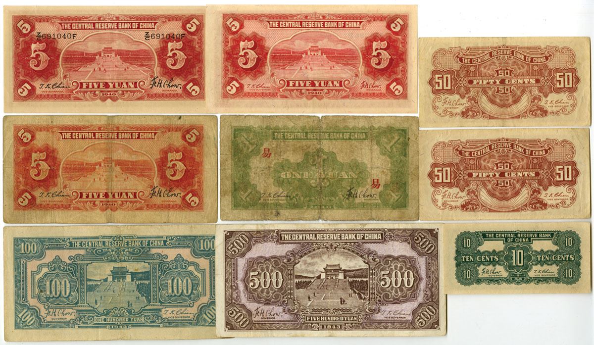China, 1940-1943 (1945). Lot of 9 Issued Banknotes, Includes: 1940, 10 Cents = 1 Chiao, P-J3a; 1940 (1941), 50 Cents = 5 Chiao, P-J5a (2); 1940, 1 Yuan, P-J8a; 1940, 5 Yuan, P-J10a, P-J10c, & P-J10e; 1943 (1944), 100 Yuan, P-J23a; 1943 (1945), 500 Yuan, P-J27a. Notes range from VF to AU condition. (9). Sold "AS IS" no returns accepted.