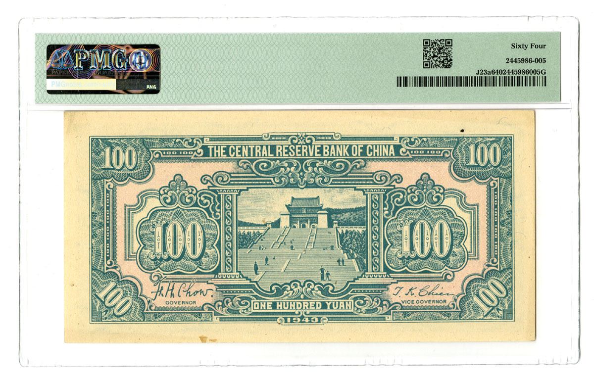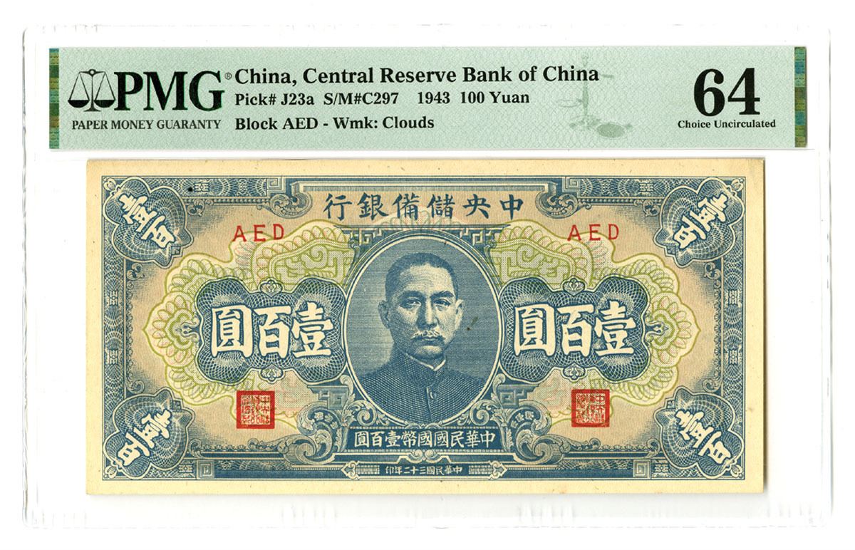 China, 1943. 100 Yuan, P-J23a, S/M#C297, Issued Banknote, Blue on green and m/c underprint with SYS at center, Back is green on pink with Temple of Heaven at center, Block AED, PMG graded Choice Uncirculated 64.