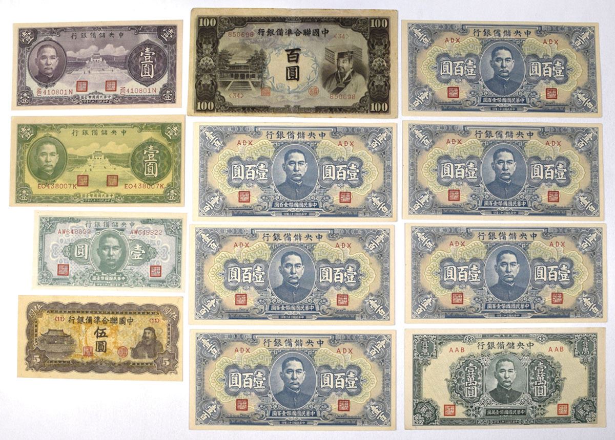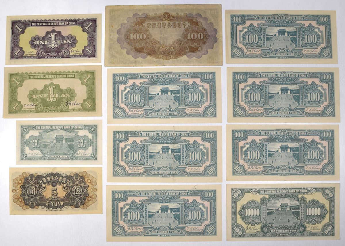 China, 1940-44. Lot of 12 Issued Banknotes, Includes: Central Reserve Bank of China, 1940, 1 Yuan, P-J8a; 1940, 1 Yuan, P-J9c; 1943, 1 Yuan, P-J19a; 1943, 100 Yuan, P-J23a (6); 1944, 10,000 Yuan, P-J38a; Federal Reserve Bank of China, ND (1944), 5 Yuan, P-J79 S/M#C286-72; ND (1944), 100 Yun, P-J83a. Notes range from VF+ to Uncirculated condition. (12). Sold "AS IS" no returns accepted.