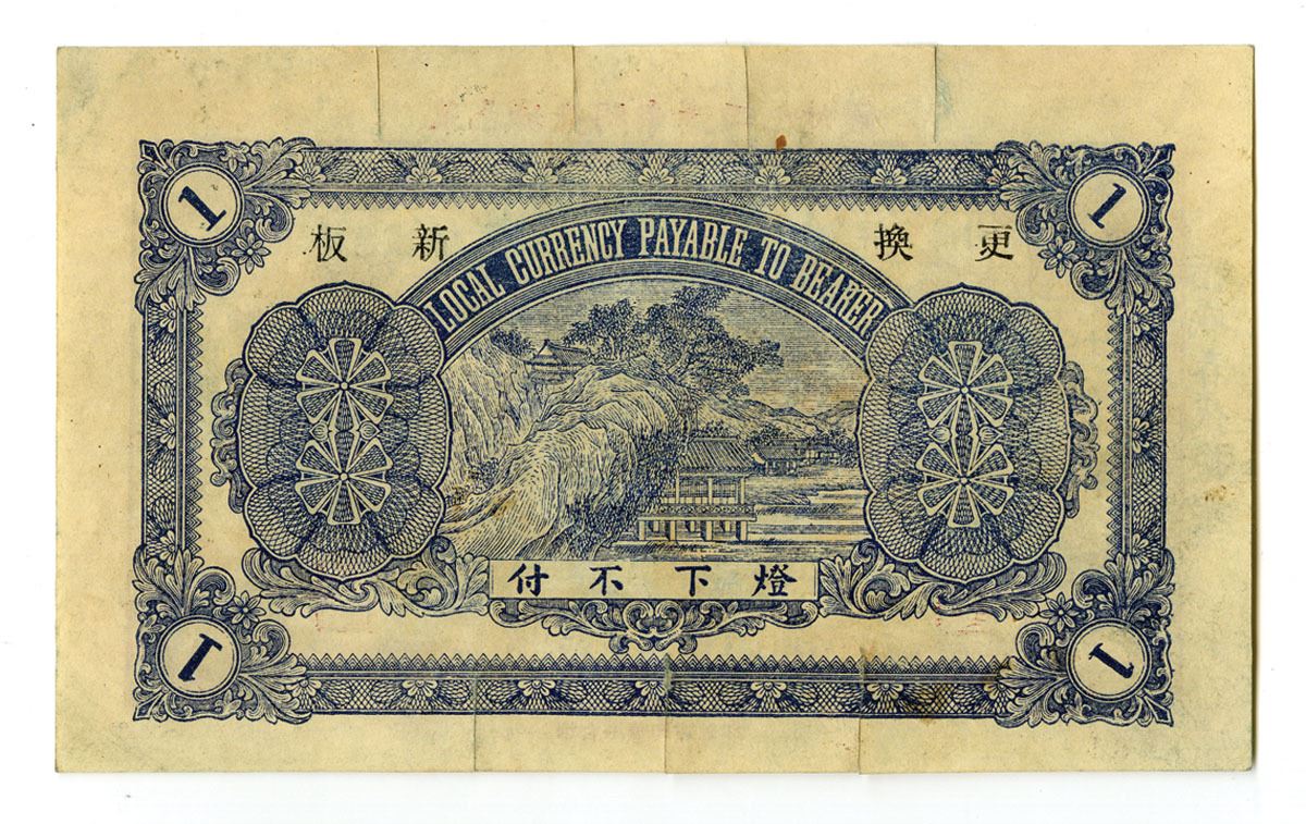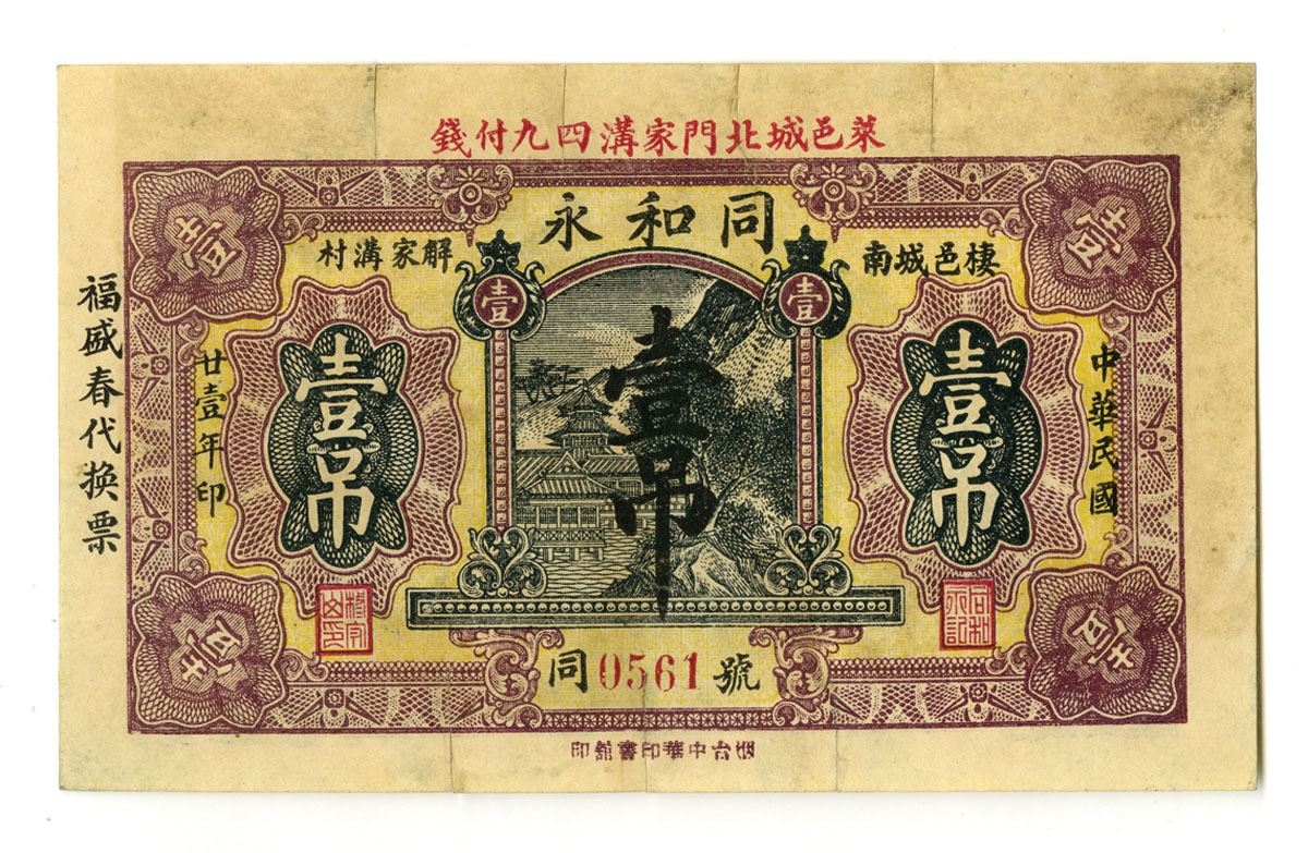 China, ca. 1930–1940s; 1 unit local merchant note issued by Fu Sheng Chun, referencing Manjia Village and North Gate District. Multicolor front; blue reverse with generic local currency payable plate. Condition: VF.